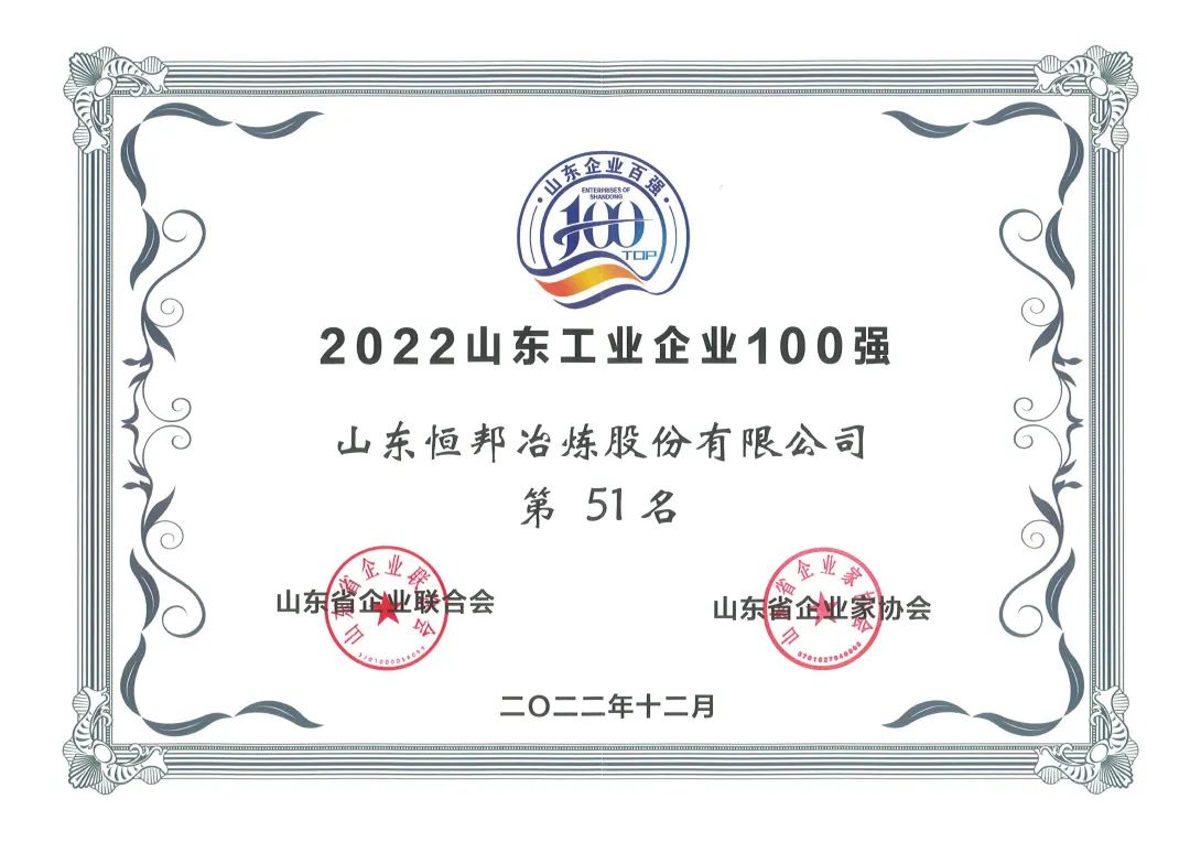 近日,山东省工业和信息化厅、山东省企业联合会公布2022山东省综合百强和工业百强企业名单。公司位居山东省综合百强企业第65位,较去年上升14名,位居山东省工业百强企业第51位,较去年上升11名。